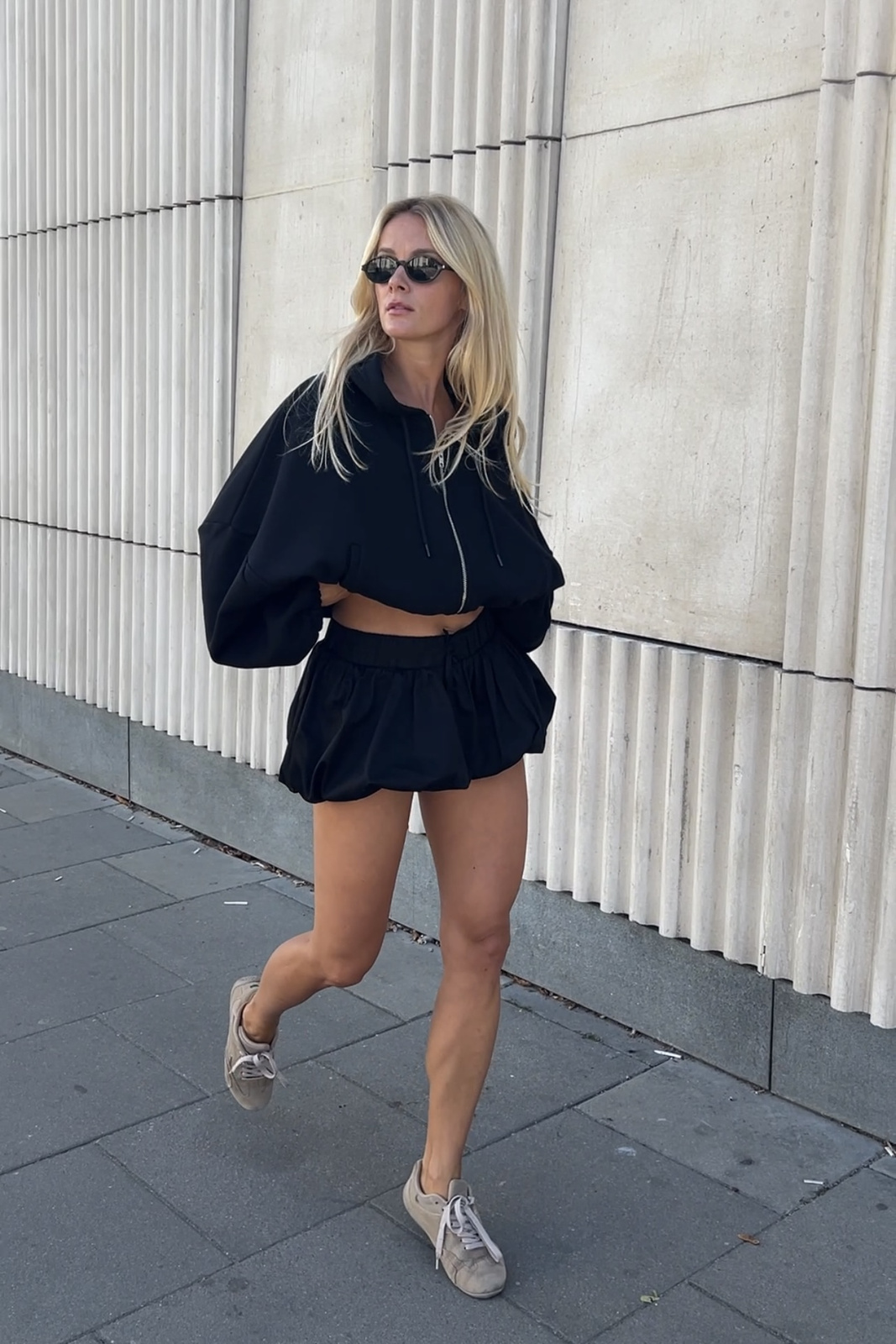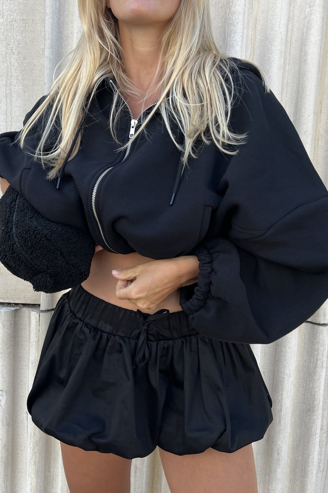 Rozpinana bluza z kapturem o oversize'owym kroju w kolorze czarnym.