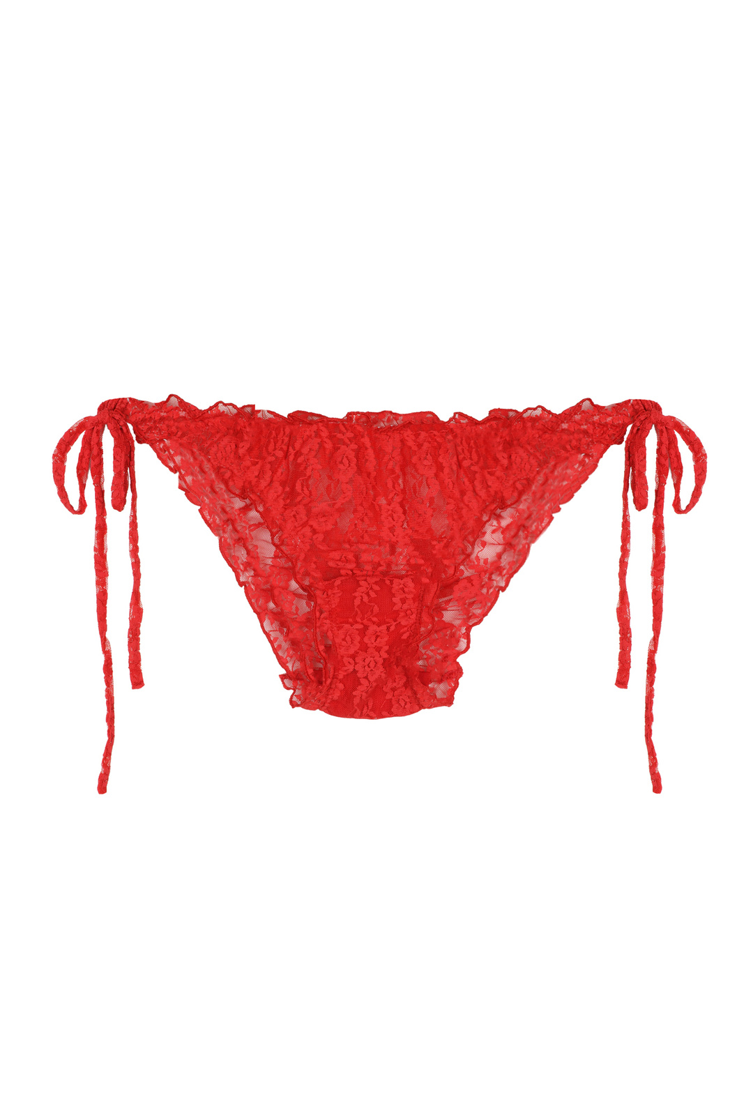 Wiązane majtki, wykonane z koronkowego materiału w kolorze czerwonym.