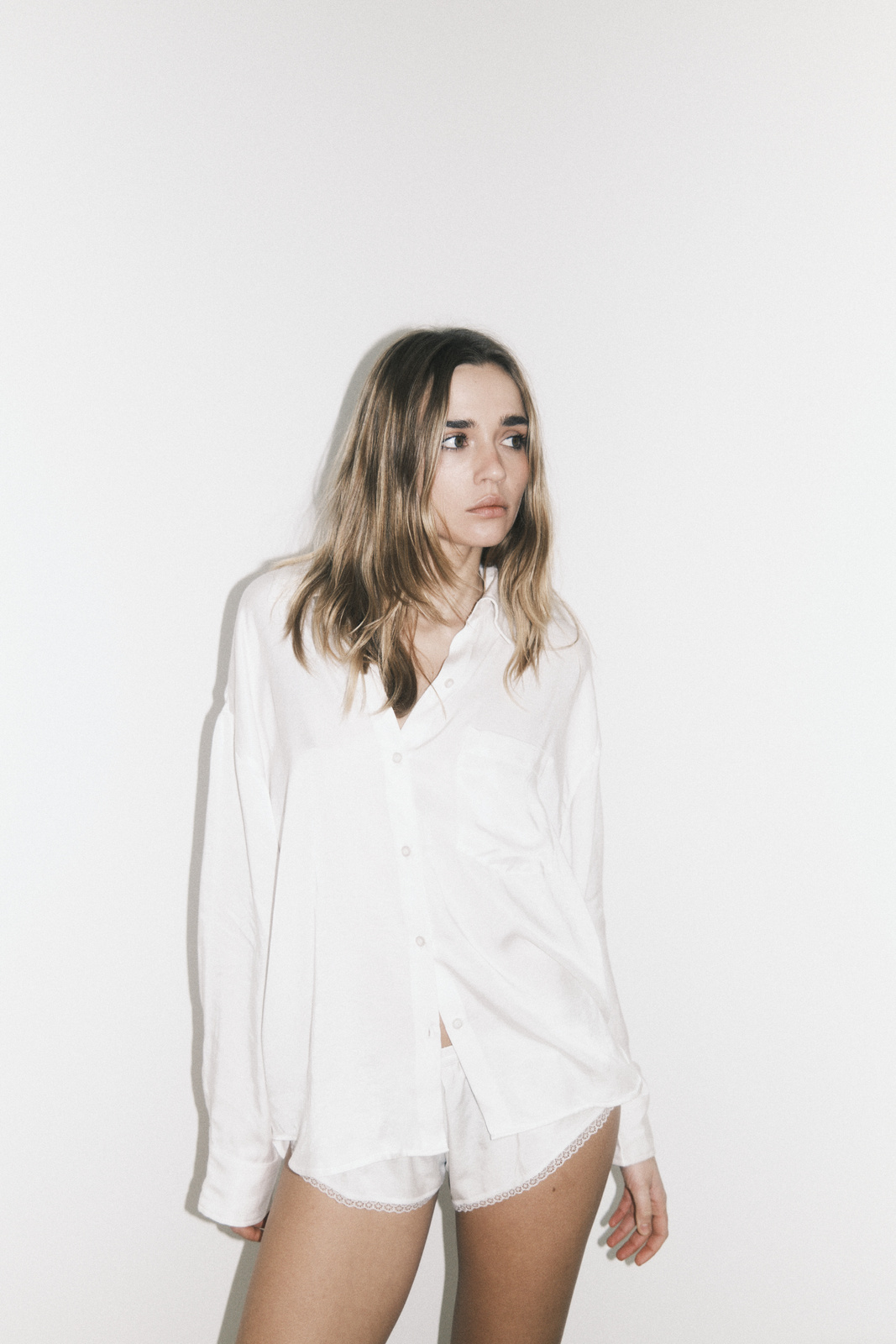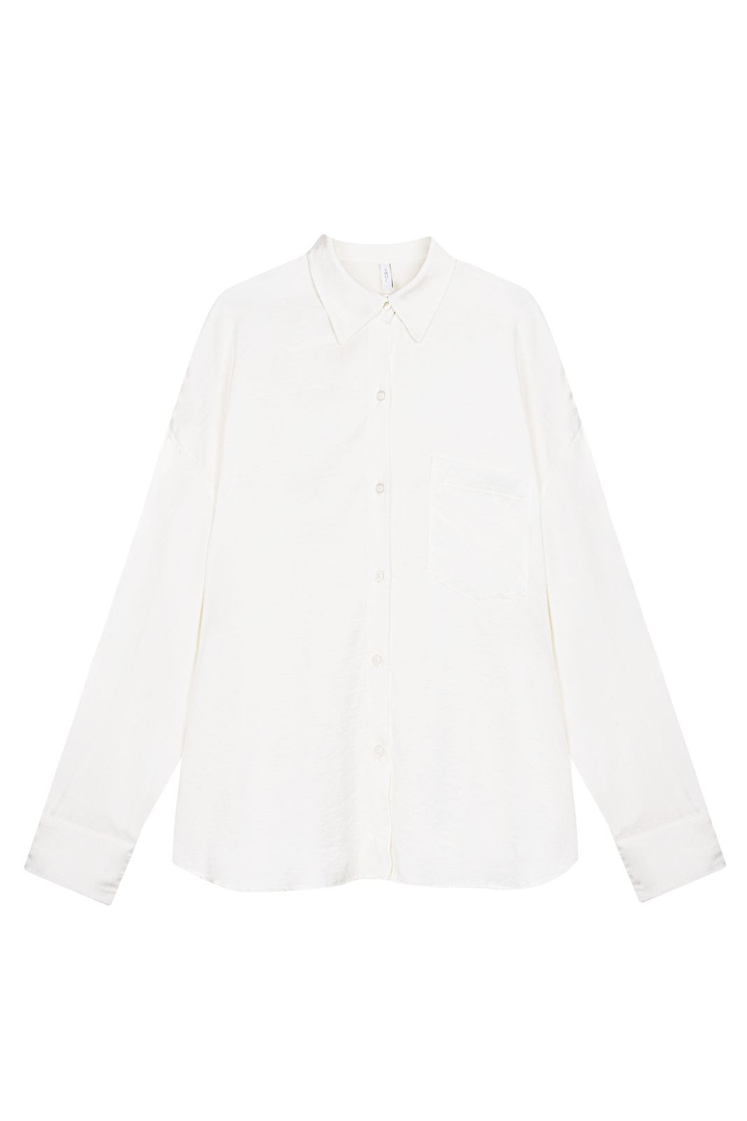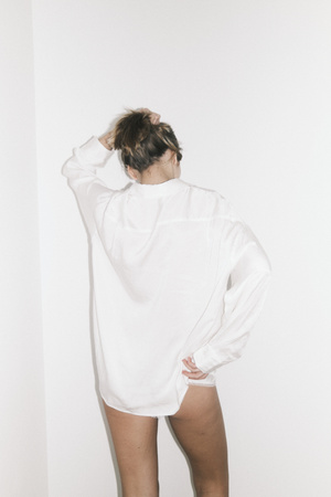 Koszula o lekko oversize'owym kroju, wykonana z wysokogatunkowego materiału o aksamitnym wykończeniu w kolorze złamanej bieli.