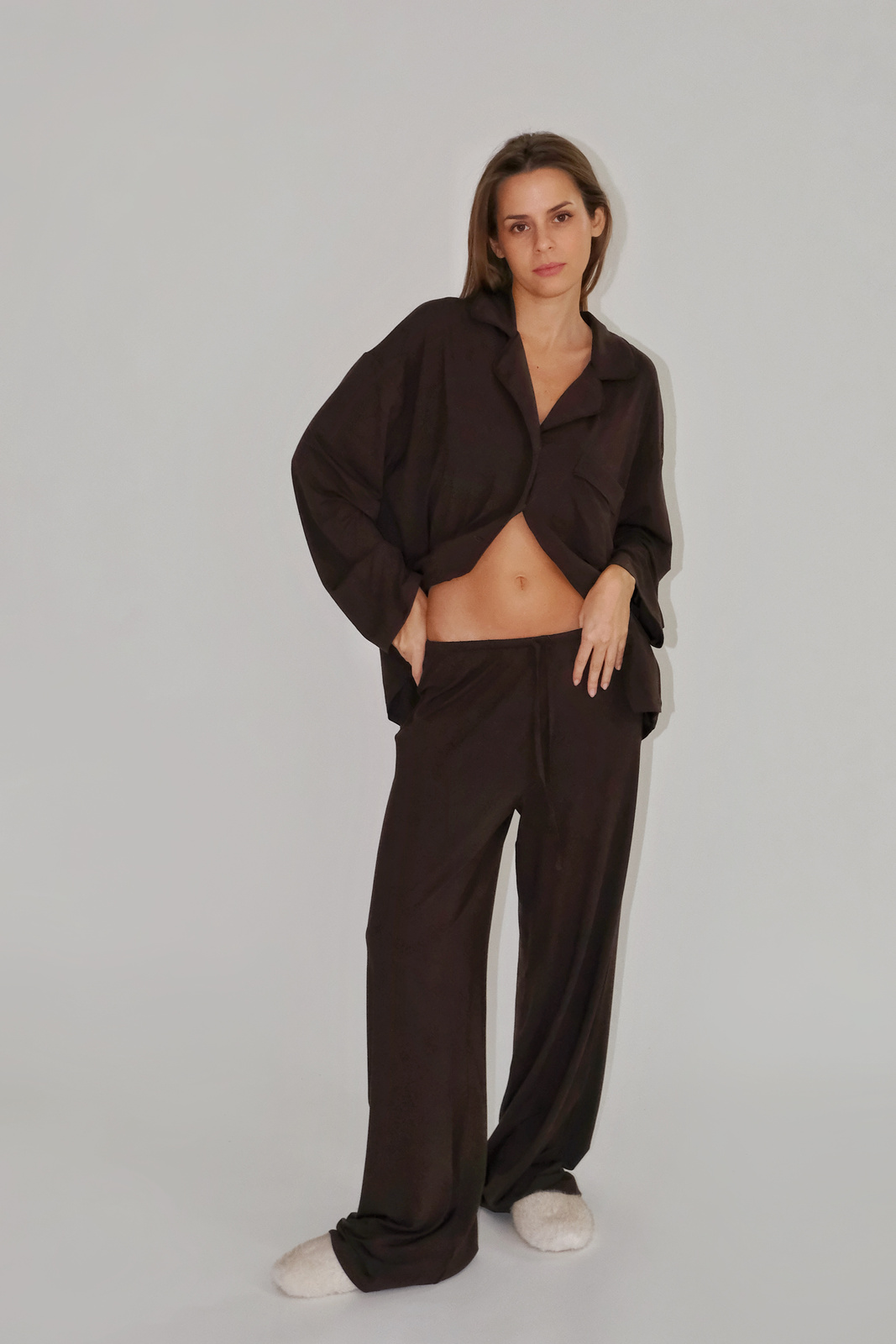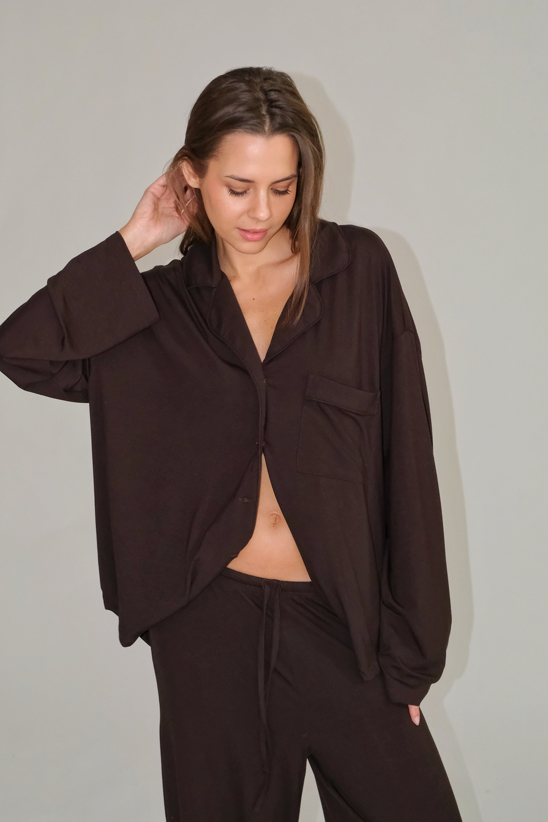 Koszula do spania o kroju oversize, wykonana z wysokogatunkowej wiskozy z domieszką elastanu w kolorze brązowym.