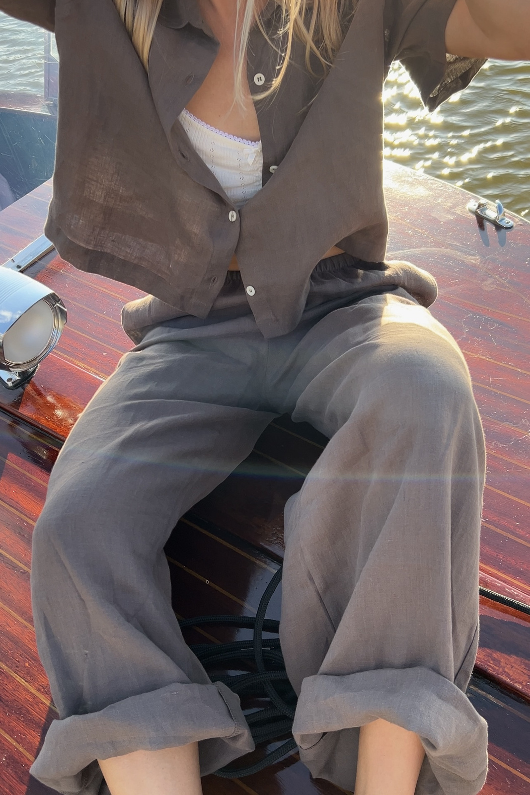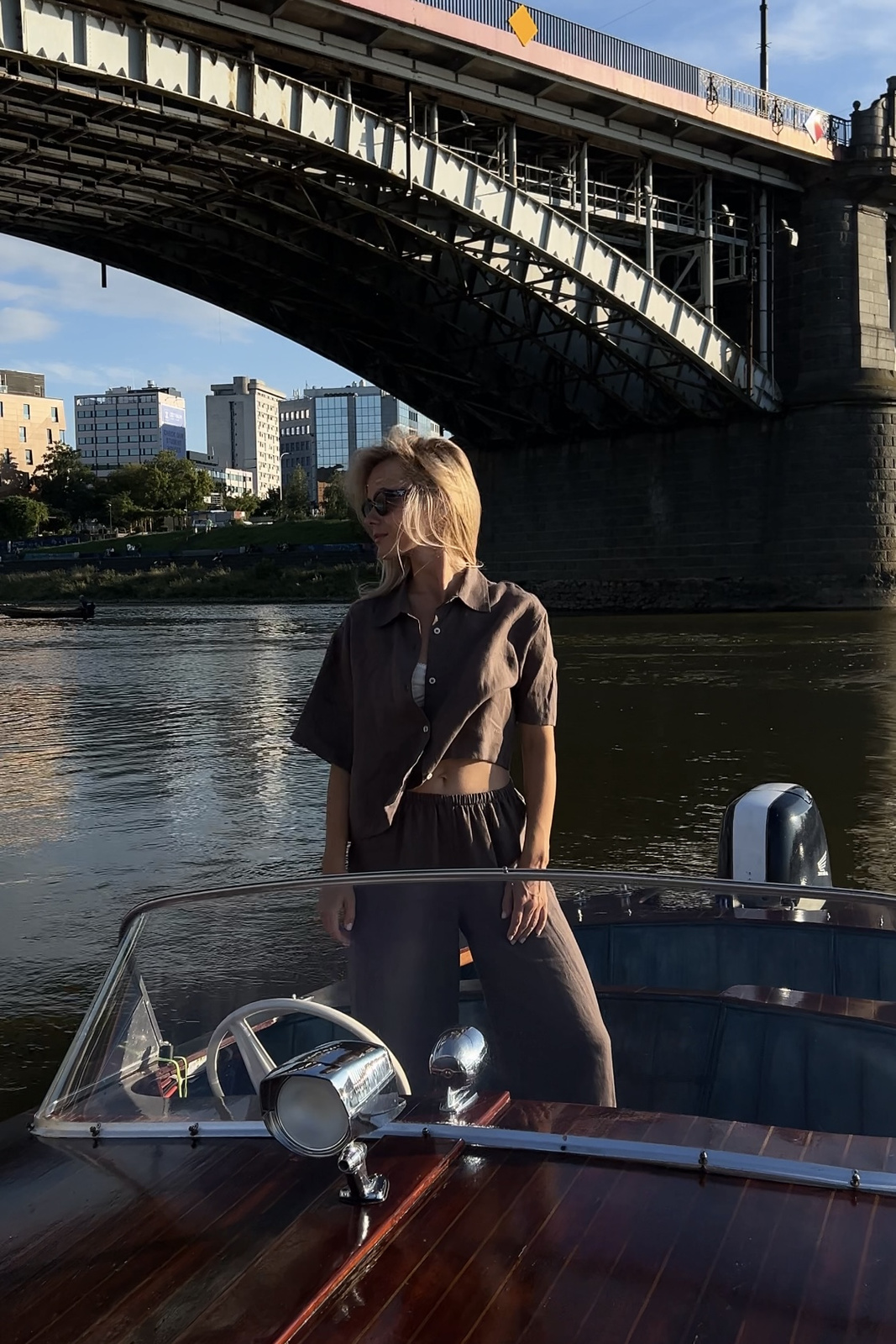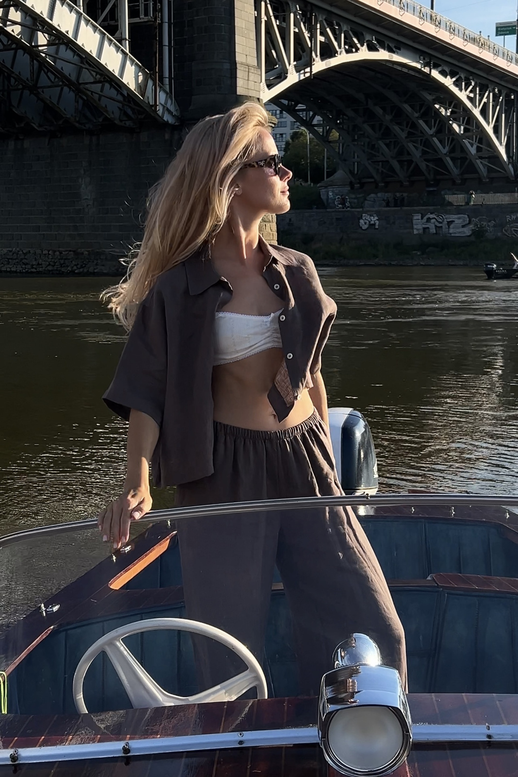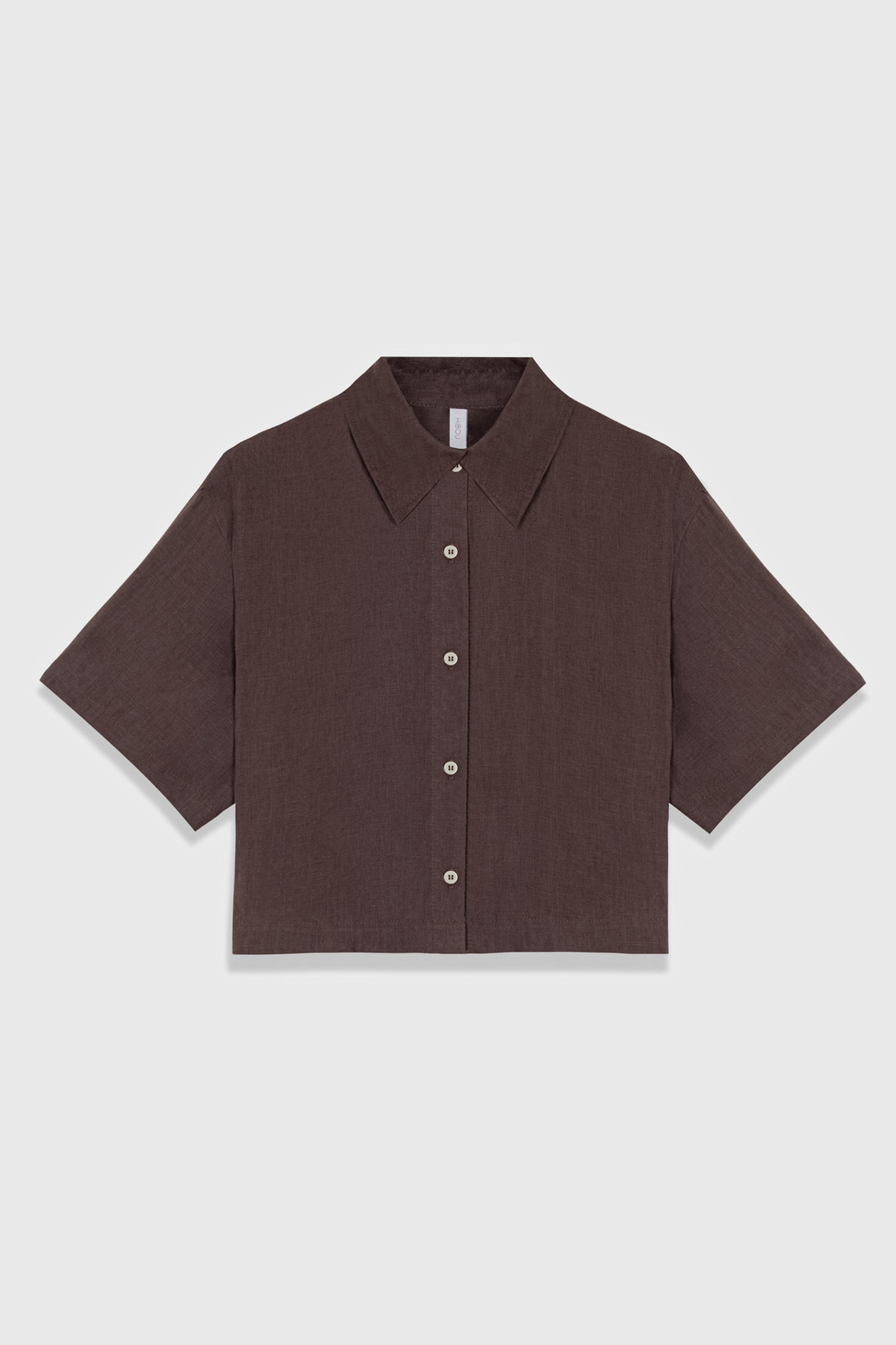 Koszula z krótkim rękawem oraz o krótszym, lekko oversize'owym kroju, wykonana z wysokogatunkowego lnu w kolorze brązowym.