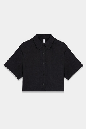 Koszula z krótkim rękawem oraz o krótszym, lekko oversize'owym kroju, wykonana z wysokogatunkowego lnu w kolorze czarnym.