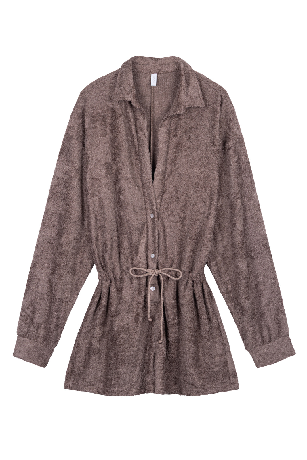 Romper z długimi rękawami, wykonany z materiału o strukturze frotte w kolorze jasnego brązowego.