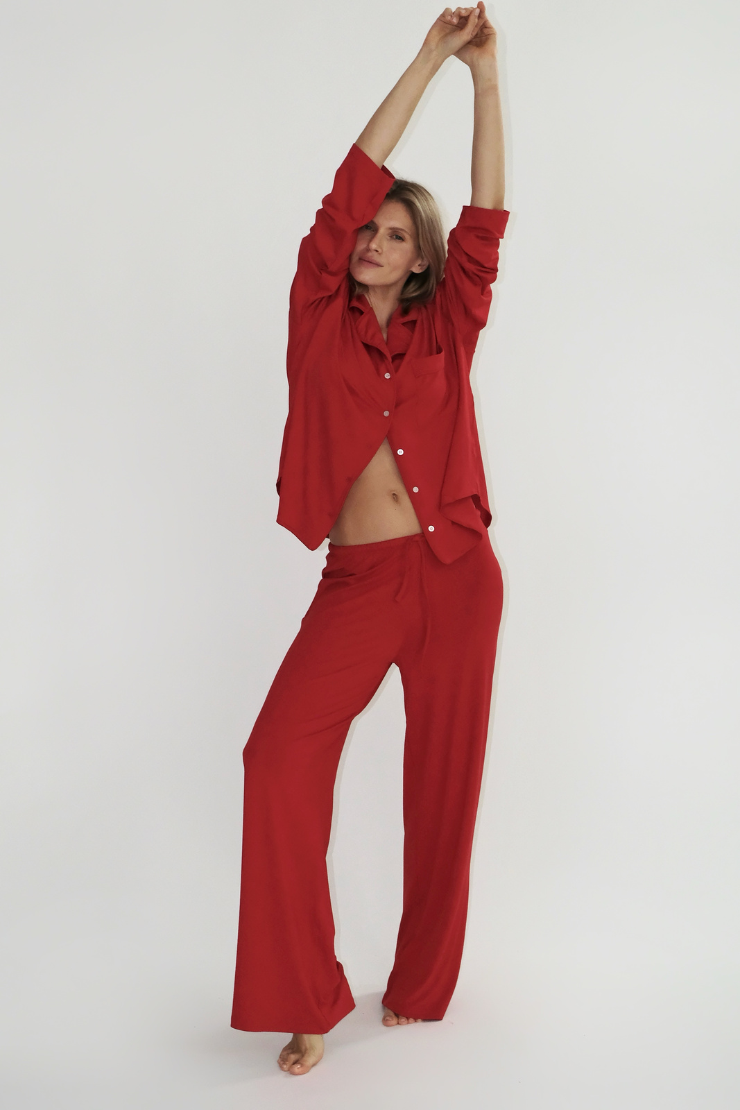 Spodnie z nogawkami o prostym, szerokim kroju w kolorze czerwonym.