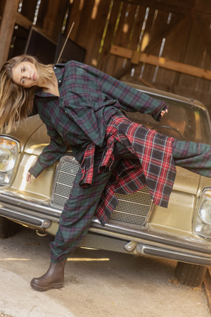 Spodnie z szerokimi nogawkami, wykonane z wysokogatunkowej bawełny w zielono-granatową kratkę.