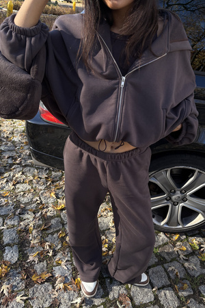 Spodnie dresowe z szerokimi nogawkami w kolorze brązowym.