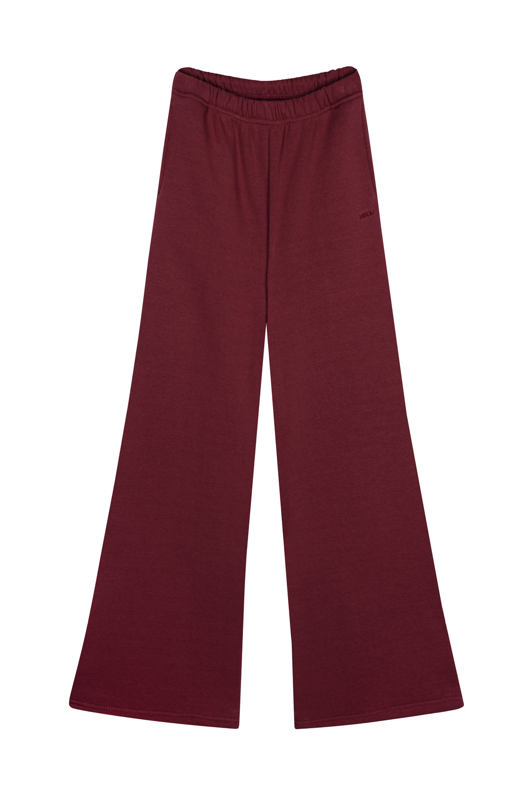 Spodnie dresowe z szerokimi nogawkami w kolorze burgundowym.