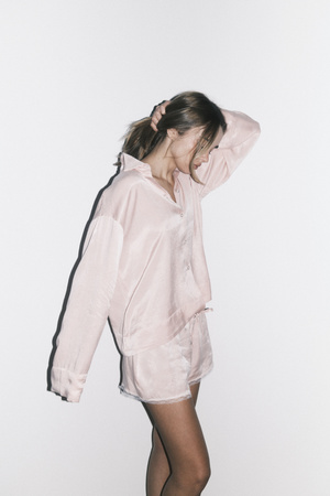 Szorty o luźnym kroju, wykonane z wysokogatunkowego materiału o aksamitnym wykończeniu z ozdobną koronką w kolorze jasnego różowego.